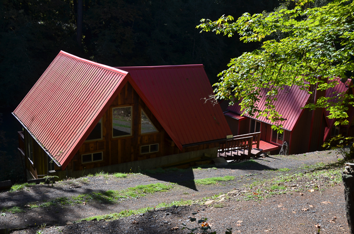 These two cabins, hovering over the river, were for sale.
