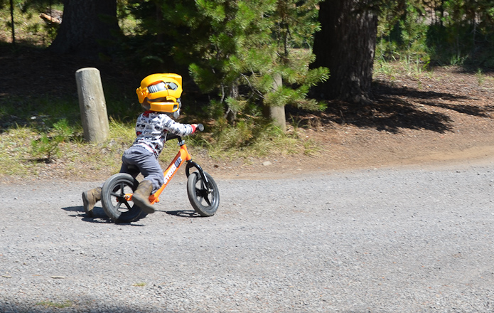 This maniacal two-year-old would fly down the road on his pedal-less bike.