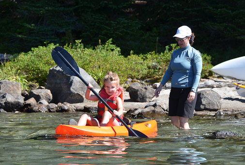 Justine gives Maddie a lesson on Ethan's kayak.