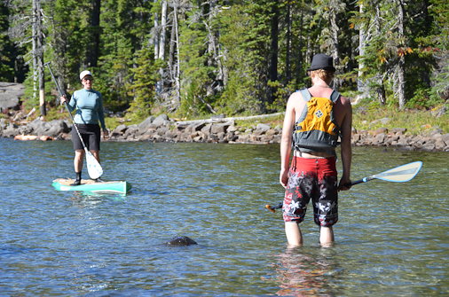 Justine offers Jaden a turn on the paddle board.
